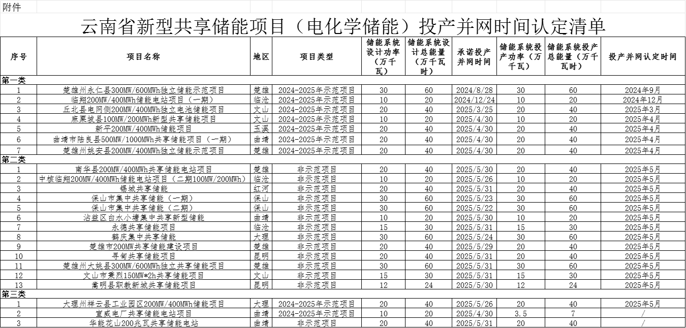 云南省能源局關(guān)于印發(fā)新型共享儲能項目(電化學儲能)投產(chǎn)并網(wǎng)時間認定清單的通知