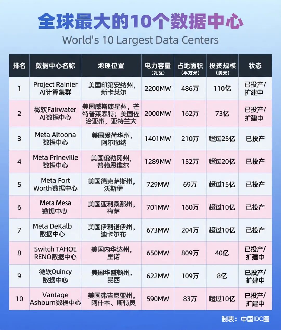 根據(jù)電力容量(MW)排名,世界上最大的10個(gè)數(shù)據(jù)中心: