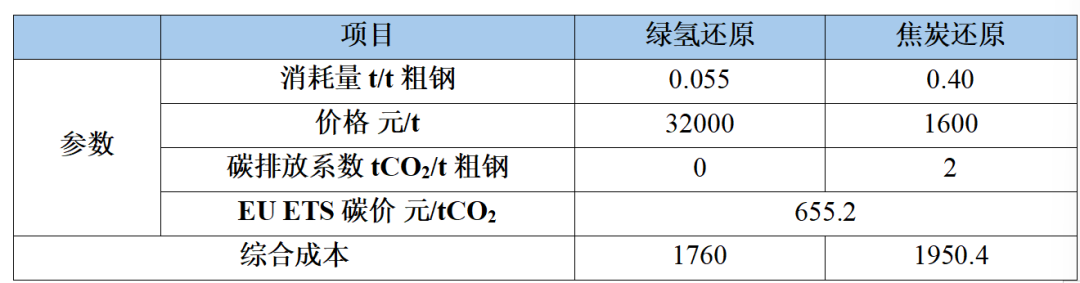 表2 焦炭冶煉與氫氣冶煉路線成本估算對(duì)比注:綠氫價(jià)格、EU ETS碳價(jià)參考公開報(bào)道與國(guó)際市場(chǎng)價(jià)格;焦炭?jī)r(jià)格參考期貨價(jià)格