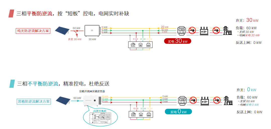 由于工商業(yè)負(fù)載往往天然“三相不平衡”:用電設(shè)備部分使用單相電源,部分使用三相電源,設(shè)備開啟時間和用電功率存在差異,很難保障三相用電負(fù)載相同,可能出現(xiàn)三相分別為 30 kW、20 kW、10 kW 這樣的情況。在防逆流場景下,傳統(tǒng)逆變器無法按需分配功率,系統(tǒng)只能按照最小相來限制整體輸出,剩余用電需要從電網(wǎng)取電。