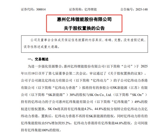 然而真正的棋局,遠比產品層面的合縱連橫更為宏大。2025年11月20日,一紙股權置換公告將億緯鋰能與韓國電池巨頭SK On的“跨國聯(lián)姻”推向了尾聲。