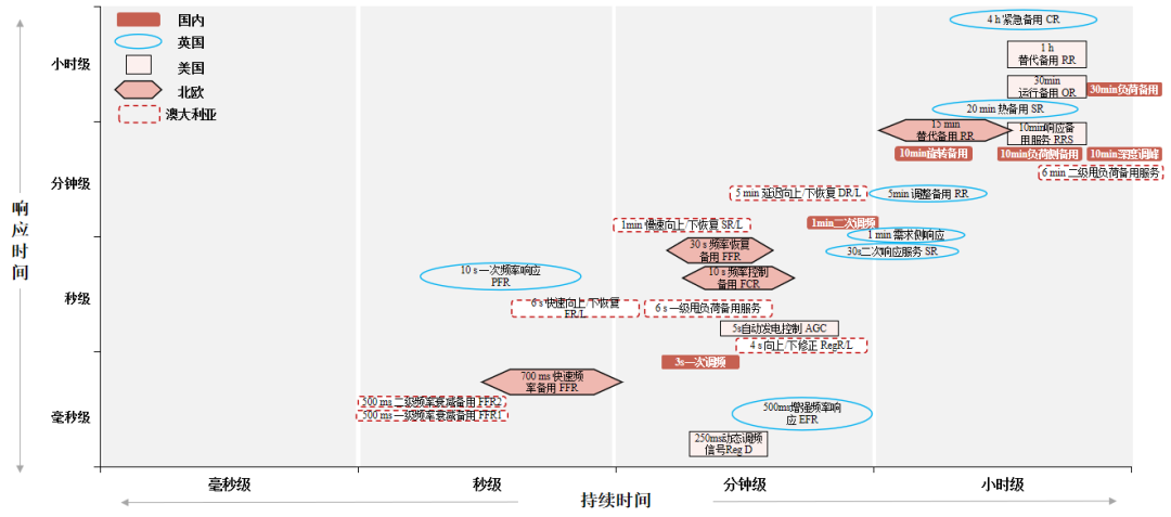 從國際經(jīng)驗看,歐美等國家的靈活調(diào)節(jié)體系更強調(diào)非計劃性調(diào)節(jié),在頻率控制調(diào)節(jié)能力、頻率恢復(fù)調(diào)節(jié)能力上,有更細致的分級與更開放的市場。同時,近年來持續(xù)細化顆粒度,新增了毫秒級響應(yīng)時間服務(wù)(美國的RegD、英國的EFR、北歐的FFR、澳大利亞的FFR1)。當(dāng)前,國內(nèi)進入輔助服務(wù)市場交易的產(chǎn)品以調(diào)峰輔助服務(wù)居多,國外成熟電力市場體系中均未設(shè)置調(diào)峰輔助服務(wù),相關(guān)能力的價值通過在現(xiàn)貨主能量市場中解決;國內(nèi)外在超短時波動調(diào)節(jié)能力上,都存在較大空缺。隨著接入電網(wǎng)的可再生能源及電力電子裝備的比例日益增大,在超短時的時間尺度上的靈活調(diào)節(jié)充裕度或?qū)⑹艿教魬?zhàn)。各國靈活調(diào)節(jié)能力產(chǎn)品的性能要求如下圖所示。