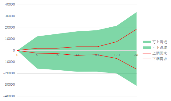 分析與評估靈活調(diào)節(jié)能力裕度時,可統(tǒng)計其指定時間范圍內(nèi)各響應(yīng)時間尺度的最大需求與最小調(diào)節(jié)能力,將上調(diào)與下調(diào)拼接到一張圖上,形成“可調(diào)域”。其次,納入最大調(diào)節(jié)需求曲線,若需求曲線全在可調(diào)域內(nèi),則表示靈活調(diào)節(jié)裕度充足;若需求曲線超出了可調(diào)域,則超出部分對應(yīng)的響應(yīng)時間尺度存在缺額。
