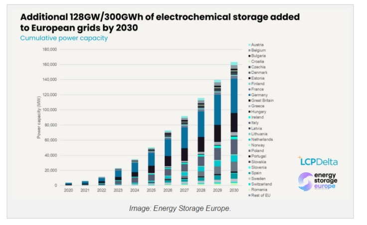 分析表明,2020年至2030年間,歐洲電網(wǎng)將新增128GW/300GWh電池儲能系統(tǒng)。