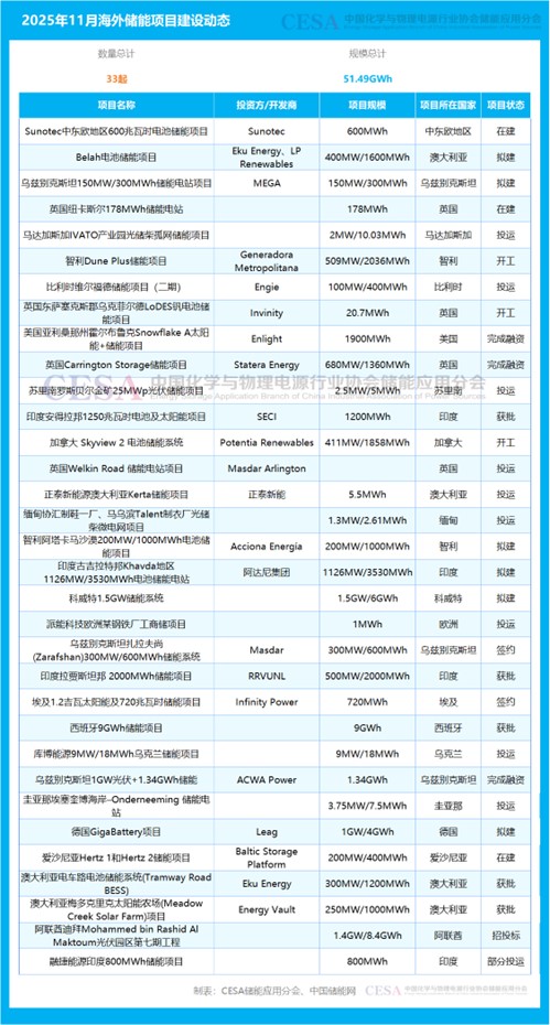 中國儲能網(wǎng)訊:2025年11月,CESA儲能應(yīng)用分會產(chǎn)業(yè)數(shù)據(jù)庫追蹤到33起海外儲能項目建設(shè)動態(tài)事件,總規(guī)模為51.49GWh,涉及Sunotec、Eku Energy、LP Renewables、MEGA、Generadora Metropolitana、Engie、Enlight、Statera Energy、SECI、Potentia Renewables、Acciona Energía、Masdar、RRVUNL、Infinity Power、ACWA Power、 Leag、Baltic Storage Platform、Eku Energy、Energy Vault等全球能源投資方/開發(fā)商,建設(shè)地點(diǎn)位于智利、英國、印度、西班牙、烏茲別克斯坦、美國、加拿大、德國、澳大利亞、愛沙尼亞、埃及、阿聯(lián)酋等全球20多個國家。