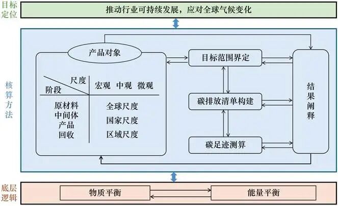 圖1展示了產(chǎn)品碳足跡核算的總體框架,包括目標定位、核算方法與底層邏輯3個方面。碳足跡核算的根本目的是推動行業(yè)可持續(xù)發(fā)展,應(yīng)對氣候變化,用于橫向比較同行業(yè)不同企業(yè)的產(chǎn)品碳足跡結(jié)果、縱向比較企業(yè)自身產(chǎn)品碳足跡變化。據(jù)此需建立統(tǒng)一規(guī)范的碳足跡核算原則與方法,確保各產(chǎn)業(yè)各節(jié)點測算結(jié)果的一致性與可比性。在LCA的方法框架下,產(chǎn)品碳足跡核算包括4個基本步驟:目標范圍界定、碳排放清單構(gòu)建、碳足跡測算、結(jié)果闡釋。4個步驟間兩兩交互反饋,根據(jù)碳足跡評估結(jié)果與應(yīng)用目標,不斷迭代,以提高核算的準度與精度,同時針對產(chǎn)品碳排放熱點環(huán)節(jié)靶向開展降碳措施。碳足跡核算結(jié)果還可以直接應(yīng)用于產(chǎn)品開發(fā)與優(yōu)化(生態(tài)設(shè)計)、企業(yè)可持續(xù)發(fā)展戰(zhàn)略規(guī)劃、公共政策制定、市場營銷、產(chǎn)品碳足跡標識與生態(tài)標志(環(huán)境標識)等方面。在確定核算的系統(tǒng)邊界時,需根據(jù)LCA方法原理,追溯其原料、中間體、產(chǎn)品、回收各階段的供應(yīng)鏈構(gòu)成。雖然產(chǎn)品碳足跡核算的方法原理清晰,但由于在全球化背景下,供應(yīng)鏈涉及全球、國家、區(qū)域等不同尺度,導(dǎo)致實踐中面臨碳足跡核算具體操作復(fù)雜、結(jié)果異質(zhì)性高的挑戰(zhàn)。這就需要穩(wěn)健的物質(zhì)平衡與能量平衡的底層邏輯支撐,即針對產(chǎn)品每個階段的單元過程,建立物質(zhì)輸入輸出平衡、能流輸入輸出清單,在此基礎(chǔ)上再形成產(chǎn)品的高分辨碳排放清單,測算其碳足跡。