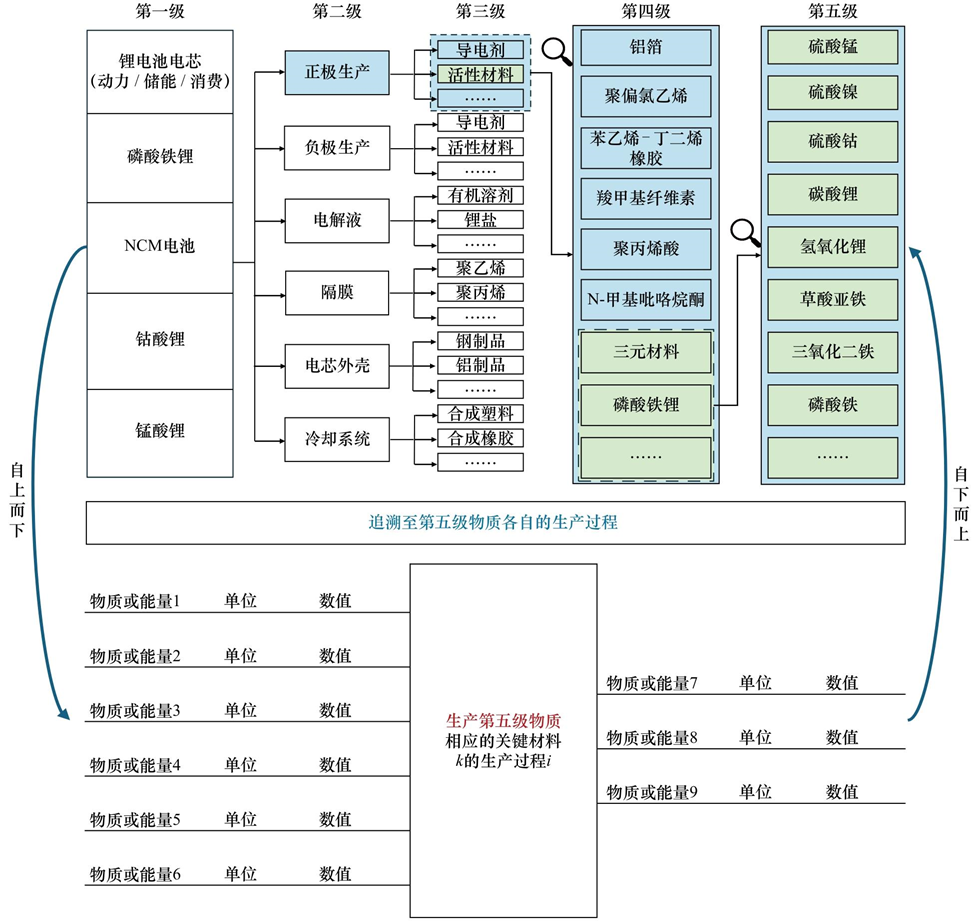 在圖3中,沿供應(yīng)鏈追溯至第五級物質(zhì)各自的生產(chǎn)過程,基于五級物質(zhì)生產(chǎn)企業(yè)的實際報表(BOM)搭建該物質(zhì)生產(chǎn)過程的實景數(shù)據(jù)清單,再匹配現(xiàn)有的碳足跡因子背景數(shù)據(jù),從而在五級物質(zhì)層面建立本土碳核算清單,自下而上將每一個物質(zhì)的碳足跡逐級加和,得到鋰電池電芯碳足跡與其產(chǎn)業(yè)鏈一至五級各級物質(zhì)的碳足跡;每一級物質(zhì)的碳足跡因子都可以作為下一級物質(zhì)核算碳足跡時采用的背景排放因子數(shù)據(jù),由此形成我國重點行業(yè)與產(chǎn)品的碳足跡核算背景數(shù)據(jù)庫。