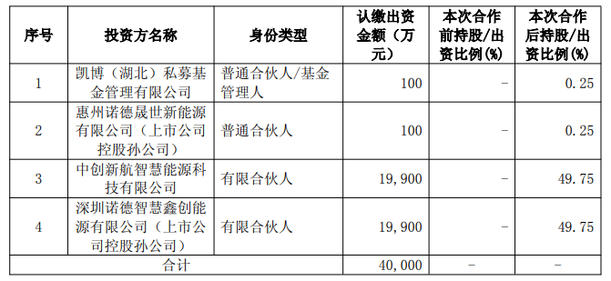 該基金以有限合伙形式組建,擬定名稱為凱博諾德先進儲能(湖北)私募股權投資基金合伙企業(yè)(有限合伙)?;鹨?guī)模4億元,其中,中創(chuàng)新航智慧能源作為LP認繳出資1.99億元,占比49.75%,諾德智慧鑫創(chuàng)能源作為LP認繳出資1.99億元,占比49.75%;凱博資本作為管理人/GP1認繳出資100萬元,惠州諾德晟世作為GP2認繳出資100萬元。后續(xù),基金可以通過擴募或設立子基金方式引進政府資金、社會資本及產業(yè)資本等。