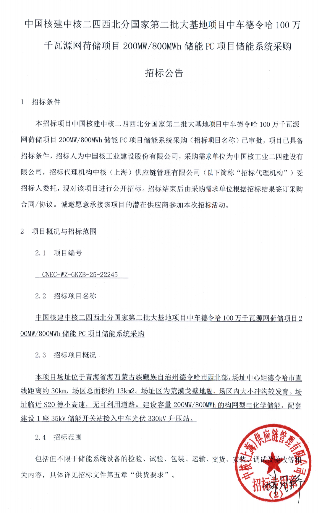 中國儲能網(wǎng)訊:2025年12月3日,中核集團發(fā)布中國核建中核二四西北分國家第二批大基地項目中車德令哈100萬千瓦源網(wǎng)荷儲項目200MW/800MWh儲能PC項目儲能系統(tǒng)采購招標(biāo)公告。