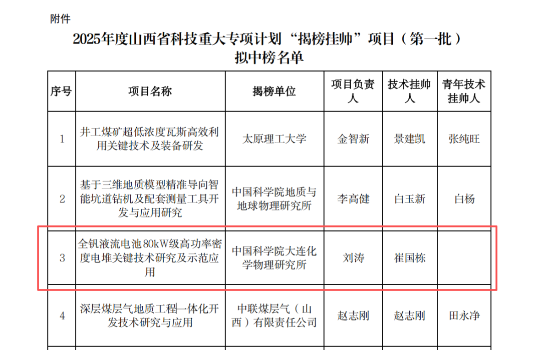 中國儲能網(wǎng)訊:12月3日,山西省科技廳發(fā)布2025年度山西省科技重大專項計劃“揭榜掛帥”項目(第一批)擬中榜名單公示,中國科學(xué)院大連化學(xué)物理研究所揭榜全釩液流電池80kW級高功率密度電堆關(guān)鍵技術(shù)研究及示范應(yīng)用。