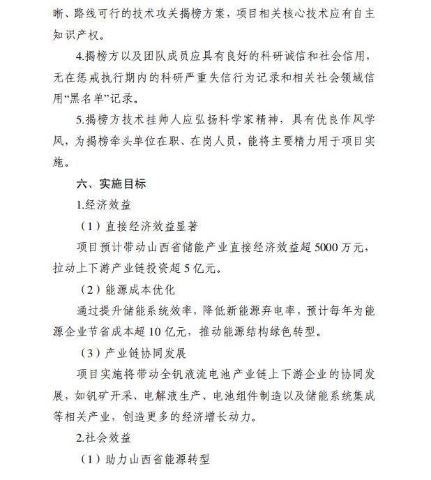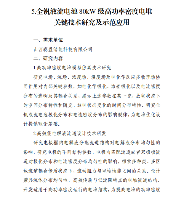 此前,7月16日,山西省科學(xué)技術(shù)廳曾發(fā)布《關(guān)于2025年度山西省科技重大專項計劃“揭榜掛帥”項目(第一批)張榜的通知》,此次張榜項目共14項。其中包含1個液流項目,全釩液流電池80kW級高功率密度電堆關(guān)鍵技術(shù)研究及示范應(yīng)用,需求單位為山西賽盈儲能科技有限公司。