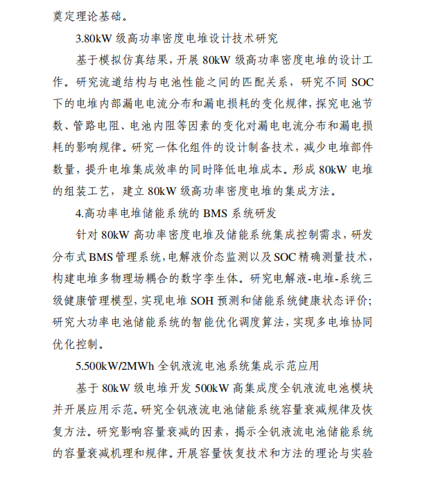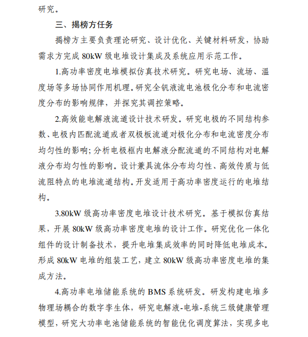 揭榜技術(shù)考核指標(biāo):1.高功率密度電堆研制:單體電堆功率≥80kW;2.高功率電堆能量效率:電堆在額定功率80kW條件下,能量效率≥82%;3.單電堆功率密度:≥120kW/m3;4.電堆成本:≤1800元/kW;5.全釩液流電池BMS系統(tǒng)的SOC檢測精度5%。