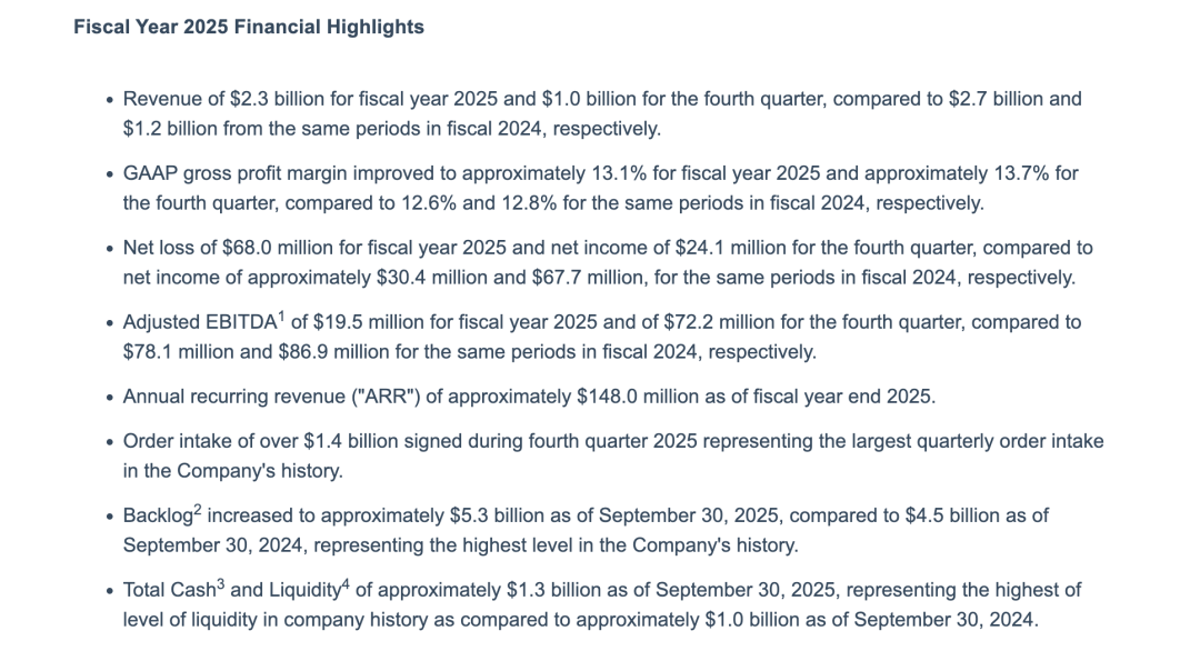 從數(shù)據(jù)上看,F(xiàn)luence 的項目交付量仍在增長。公司在2025財年第四季度簽訂新訂單14億美元,創(chuàng)下單季紀(jì)錄。但盡管項目數(shù)量上升,利潤卻下滑(2025財年凈虧損6800萬美元),說明單項目收入(ASP)出現(xiàn)下行。