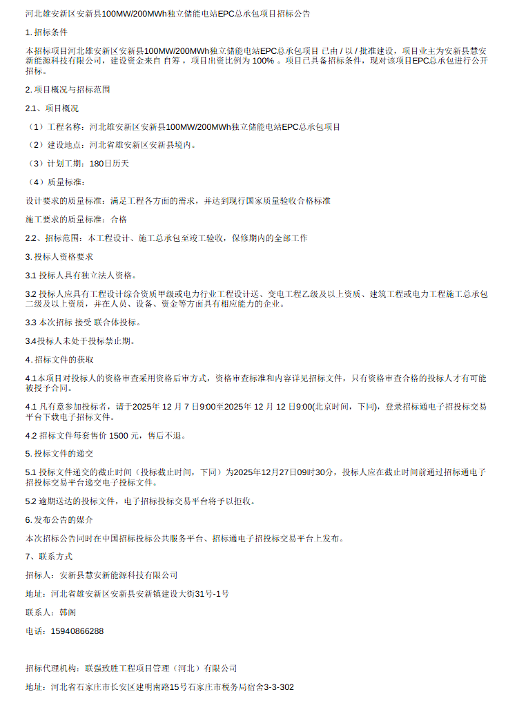 中國儲能網(wǎng)訊:12月7日,河北雄安新區(qū)安新縣100MW/200MWh獨立儲能電站EPC總承包項目招標(biāo)公告發(fā)布。項目業(yè)主為安新縣慧安新能源科技有限公司,建設(shè)資金來自 自籌 ,項目出資比例為 100% 。項目已具備招標(biāo)條件,現(xiàn)對該項目EPC總承包進(jìn)行公開招標(biāo)。河北雄安新區(qū)安新縣100MW/200MWh獨立儲能電站EPC總承包項目,建設(shè)地點在河北省雄安新區(qū)安新縣境內(nèi),項目計劃工期180日歷天。招標(biāo)范圍包括本工程設(shè)計、施工總承包至竣工驗收,保修期內(nèi)的全部工作。投標(biāo)人應(yīng)具有工程設(shè)計綜合資質(zhì)甲級或電力行業(yè)工程設(shè)計送、變電工程乙級及以上資質(zhì)、建筑工程或電力工程施工總承包二級及以上資質(zhì),并在人員、設(shè)備、資金等方面具有相應(yīng)能力的企業(yè)。本次招標(biāo)接受聯(lián)合體投標(biāo)。