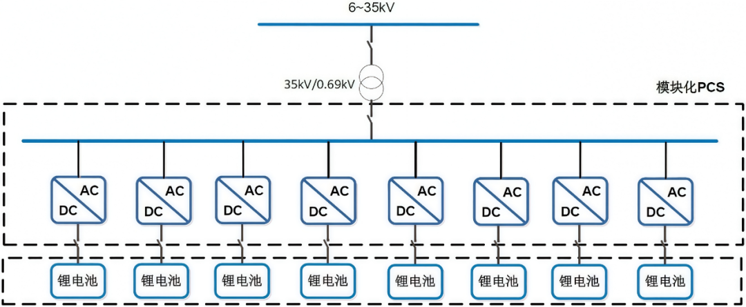 傳統(tǒng)集中式儲(chǔ)能系統(tǒng)一般將多個(gè)電池簇并聯(lián)匯流,通過(guò)兆瓦級(jí)儲(chǔ)能變流器(PCS)進(jìn)行集中式能量處理。這種儲(chǔ)能架構(gòu)的拓?fù)浣Y(jié)構(gòu)簡(jiǎn)單,PCS單機(jī)功率相對(duì)較大,初期設(shè)備成本較低。但將大量電池簇直接并聯(lián)的粗放式能量管理會(huì)引發(fā)“木桶效應(yīng)”、簇間環(huán)流等固有缺陷,導(dǎo)致系統(tǒng)可用容量降低,故障易擴(kuò)散,制約大規(guī)模應(yīng)用安全性與經(jīng)濟(jì)性。