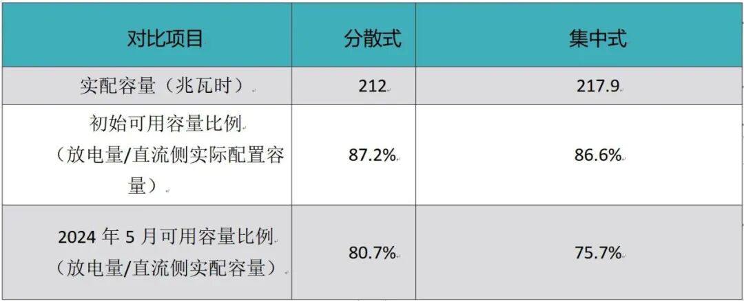 某省2021年同期建成的兩座百兆瓦級(jí)儲(chǔ)能電站規(guī)模均為100兆瓦/200兆瓦時(shí),均采用同品牌280安時(shí)電池,但分別采用了分散式與集中式技術(shù)。經(jīng)過(guò)近兩年半的運(yùn)行后,分散式電站的可用容量比例仍高出集中式5個(gè)百分點(diǎn),凸顯了分散式技術(shù)高可用容量的優(yōu)勢(shì)。對(duì)比情況如表1所示。
