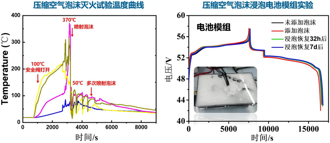 針對(duì)以上痛點(diǎn),清能院自主研發(fā)了壓縮空氣泡沫滅火系統(tǒng)。該系統(tǒng)通過(guò)生成低含水量的氣液兩相滅火介質(zhì),有效融合氣體與液體滅火優(yōu)勢(shì),可實(shí)現(xiàn)秒級(jí)滅火、快速降溫,并能保證12小時(shí)以上持續(xù)抗復(fù)燃。該系統(tǒng)所產(chǎn)泡沫電導(dǎo)率極低,對(duì)電池電學(xué)性能無(wú)影響,從根本上避免了因絕緣問(wèn)題引發(fā)的二次電氣事故。