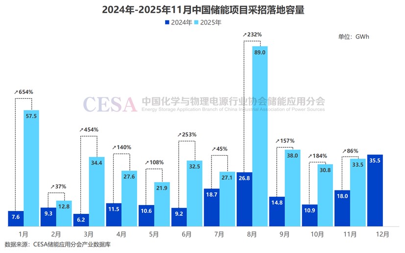 中國儲(chǔ)能網(wǎng)訊:2025年11月,CESA儲(chǔ)能應(yīng)用分會(huì)共追蹤到322個(gè)儲(chǔ)能采招落地項(xiàng)目,其中包括儲(chǔ)能EPC/PC、儲(chǔ)能系統(tǒng)、儲(chǔ)能電芯、BMS、PCS、EMS等采購以及研發(fā)、設(shè)計(jì)、施工、運(yùn)營、容量租賃等全流程招標(biāo)項(xiàng)目。其中,11月儲(chǔ)能EPC/PC(含直流側(cè)設(shè)備)、儲(chǔ)能系統(tǒng)、儲(chǔ)能電芯采招落地總規(guī)模達(dá)11.5GW/33.5GWh,容量規(guī)模同比增長86%,環(huán)比+9%。