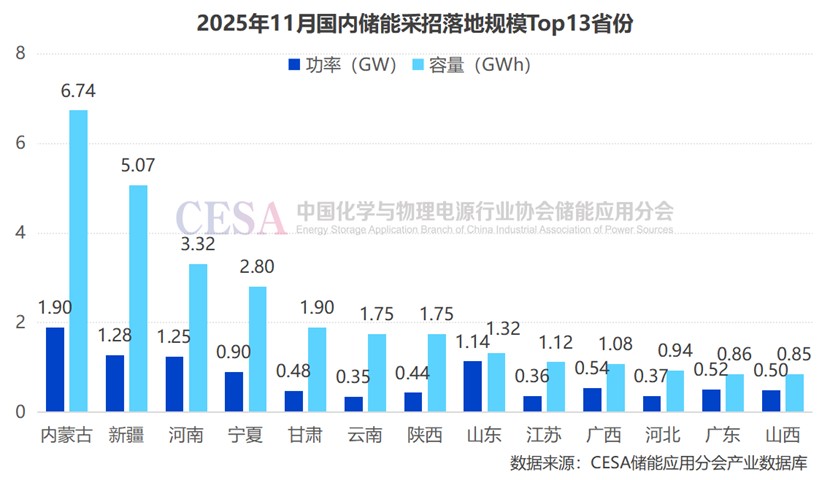 從地區(qū)來看,11月,內(nèi)蒙古儲(chǔ)能采招落地規(guī)模最大,達(dá)1.9GW/6.74GWh,新疆緊隨其后,Top 10省采招落地規(guī)模均超1GWh。