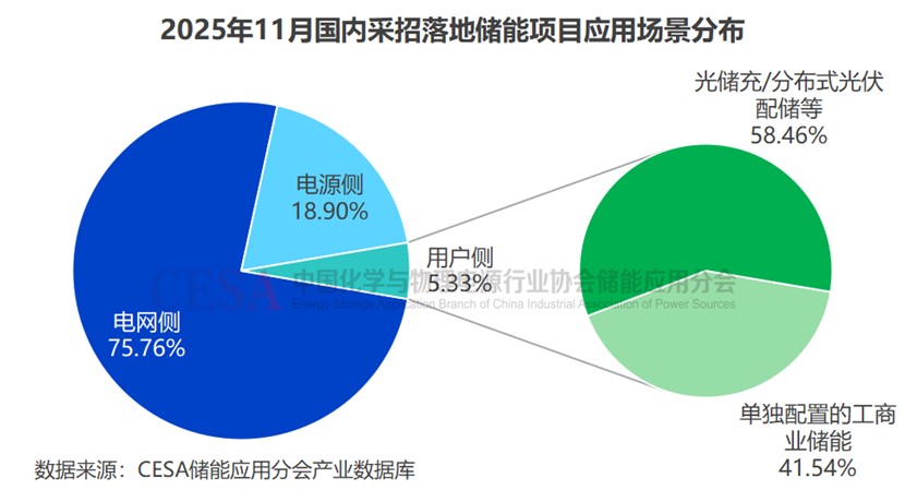 就應(yīng)用場景來看,2025年11月,應(yīng)用場景明確的儲(chǔ)能(含直流側(cè)設(shè)備)項(xiàng)目(不含集采/框采)采招落地規(guī)模達(dá)11.4GW/33.27GWh,電網(wǎng)側(cè)占比進(jìn)一步擴(kuò)大,采招落地8.64GW/26.43GWh,占比75.76%(功率)/79.44%(容量)。