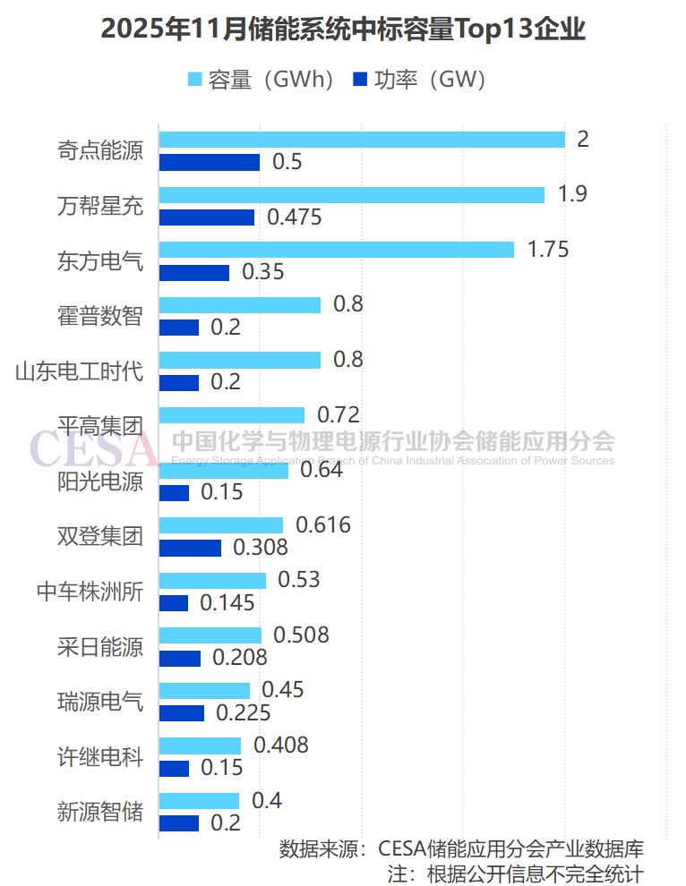 2025年11月,奇點(diǎn)能源儲(chǔ)能系統(tǒng)中標(biāo)規(guī)模500MW/2GWh,位居全國榜首,萬幫星充、東方電氣儲(chǔ)能系統(tǒng)中標(biāo)規(guī)模均超1GWh,分別排在第二、第三。Top 10 企業(yè)儲(chǔ)能系統(tǒng)中標(biāo)規(guī)模均在500MWh以上。