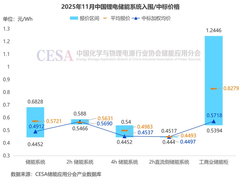 據(jù)CESA儲(chǔ)能應(yīng)用分會(huì)產(chǎn)業(yè)數(shù)據(jù)庫不完全統(tǒng)計(jì),2025年11月,國內(nèi)磷酸鐵鋰電池儲(chǔ)能系統(tǒng)(不含工商業(yè)儲(chǔ)能柜)報(bào)價(jià)主要集中在0.4452-0.6828元/Wh區(qū)間內(nèi),平均報(bào)價(jià)0.5721元/Wh,中標(biāo)加權(quán)均價(jià)0.4912元/Wh,環(huán)比-6.4%,較之10月小幅下探。
