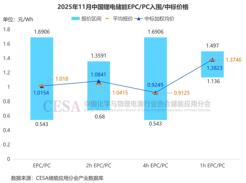 據(jù)CESA儲(chǔ)能應(yīng)用分會(huì)產(chǎn)業(yè)數(shù)據(jù)庫不完全統(tǒng)計(jì),2025年11月,國內(nèi)磷酸鐵鋰電池儲(chǔ)能EPC/PC(不含工商業(yè)儲(chǔ)能柜EPC/PC)報(bào)價(jià)主要集中在0.543-1.6906元/Wh區(qū)間內(nèi),平均報(bào)價(jià)1.018元/Wh,中標(biāo)加權(quán)均價(jià)1.0154元/Wh,環(huán)比+13.4%。