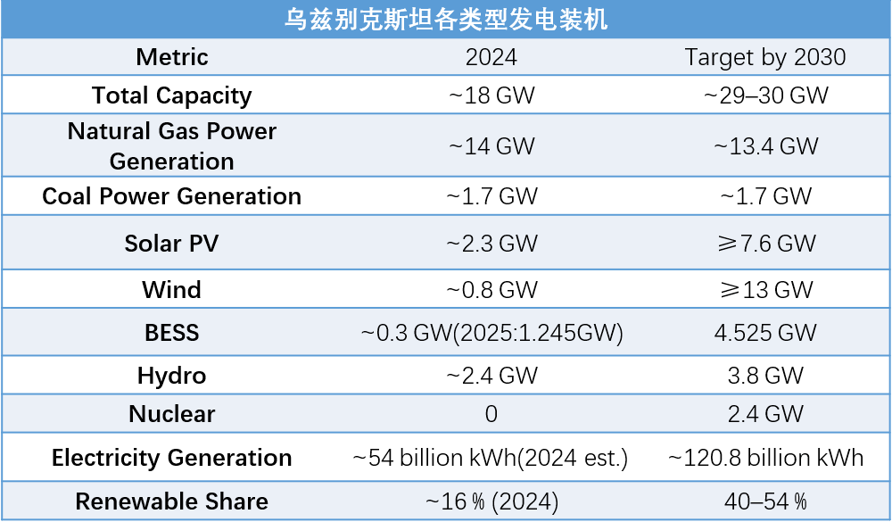 根據(jù)公開數(shù)據(jù),2024年烏茲別克斯坦電力總產(chǎn)量約815億千瓦時,預(yù)計到2030年、2035年全國電力需求將分別達(dá)到1170億千瓦時和1350億千瓦時。為應(yīng)對能源結(jié)構(gòu)轉(zhuǎn)型,烏茲別克斯坦計劃到2030年新增不低于17GW新能源發(fā)電裝機(jī),其中2025年將新增18個光伏及風(fēng)電項目,累計容量3.4吉瓦,并配套建設(shè)1.8吉瓦儲能設(shè)施。當(dāng)前,烏茲別克斯坦主干電網(wǎng)以220千伏為主,500千伏線路主要用于跨區(qū)域或跨國輸電。