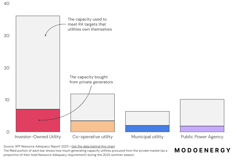 投資者所有的電力公司滿足了SPP 58%的負荷,并購買了雙邊資源充足性市場所采購容量的49%。