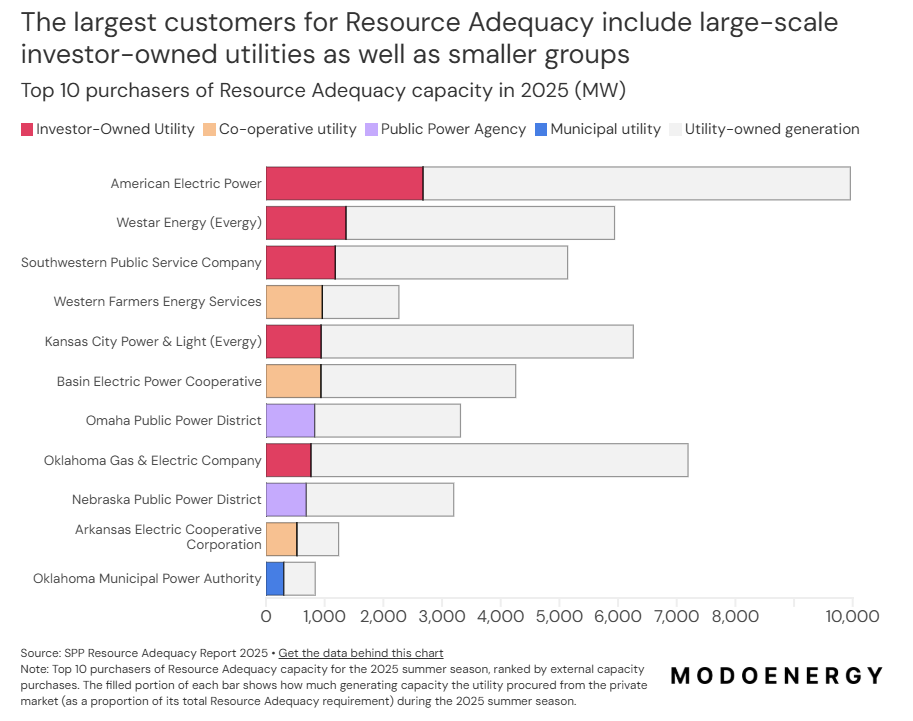 例如,Western Farmers Energy Services公司從其資源充足性需求中,向獨立發(fā)電商采購了42%(960兆瓦),這使其成為2025年容量采購的前五大客戶之一。