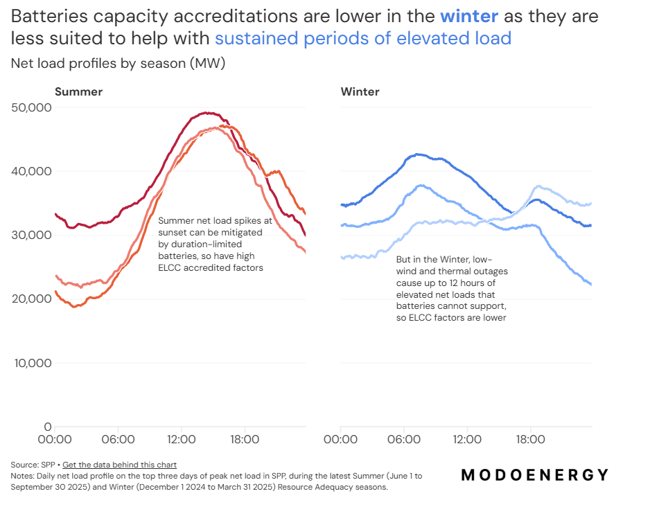 相比之下,夏季的缺電情景由傍晚凈負荷的尖峰導(dǎo)致。像電池這樣快速響應(yīng)但受限于持續(xù)時間的發(fā)電機可以迅速滿足這一需求,因此其ELCC系數(shù)更高。