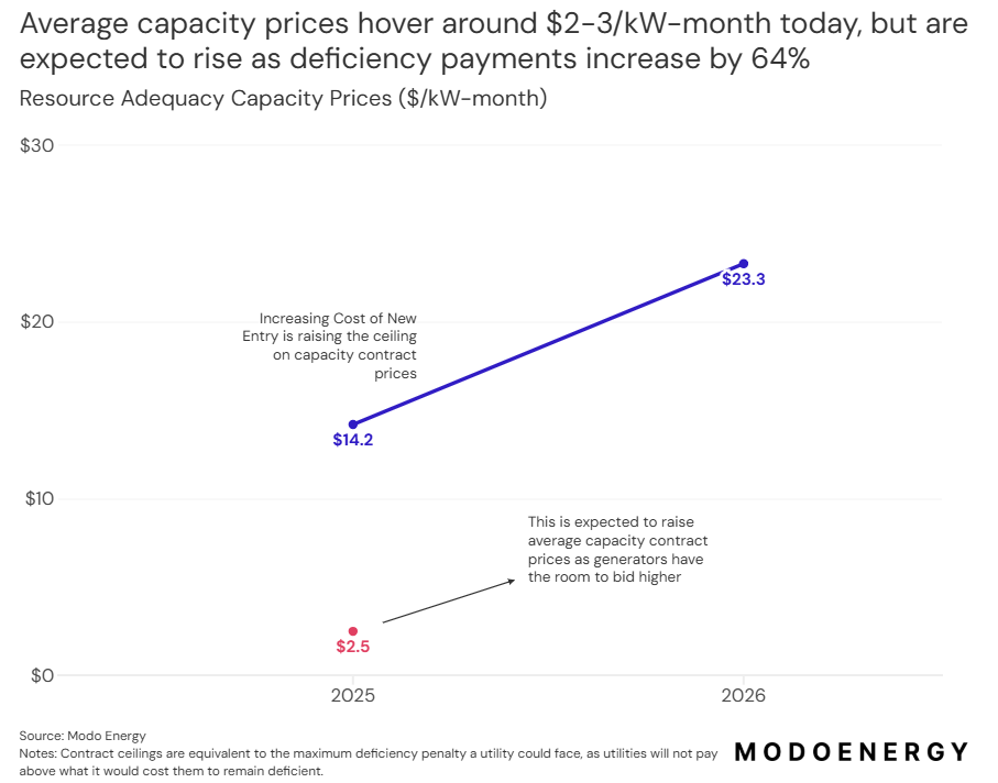 2026年,考慮到新建燃氣輪機成本的增加,該參考CONE預(yù)計將從85.61美元/千瓦-年提高到139.85美元/千瓦-年。這意味著最高罰金(設(shè)定為CONE的兩倍)將上漲64%,從171美元/千瓦-年(14.2美元/千瓦-月)提高到280美元/千瓦-年(23.3美元/千瓦-月)。