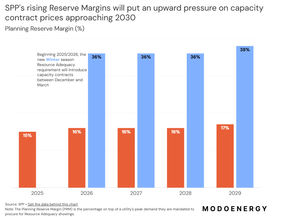 從2026年開始,夏季備用裕度將從15%提高至16%,同時冬季將引入新的36%的裕度要求。預(yù)計這將減少市場上的過剩容量,并推高容量價格。