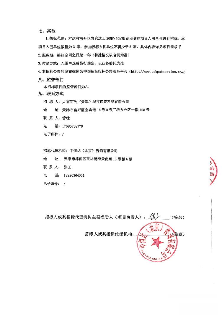中國儲能網訊:12月9日,南開區(qū)宜賓道20MW/50MWH工商業(yè)儲能項目入圍單位招標項目招標公告發(fā)布。