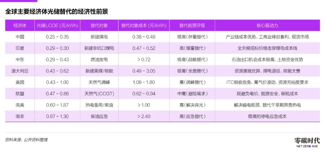 與此同時,在印度和南非等新興市場,光儲要么擊穿了新建煤電的成本線,要么成為替代昂貴柴油發(fā)電的最佳選項。光伏和儲能的成本下降正在讓光儲替代從“政策推動”全面轉入“利潤驅動”時代。