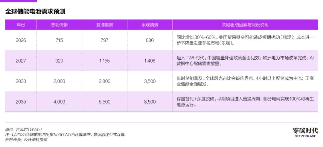 為了應對這些剛需,未來的儲能需求將呈指數(shù)級增長。多家機構預測,在基準情景下,2030年全球僅電網的儲能需求就將超過TWh級別。而為了應對更深的“鴨子曲線”,配儲時長將從2小時向4小時延伸,樂觀情景下的需求將更為驚人。這部分由物理剛需驅動的市場增量,具有極高的確定性,不會隨短期補貼政策的波動而改變。