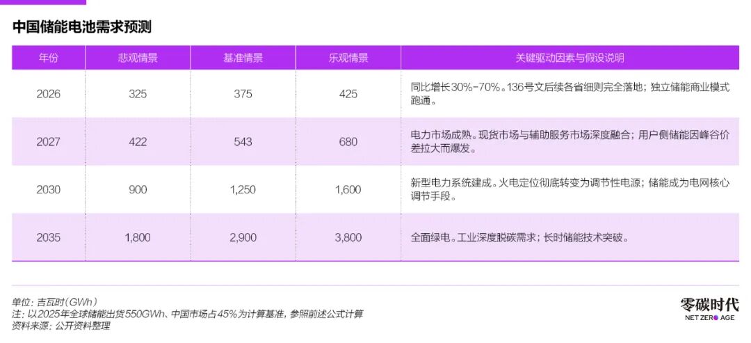 預測中最關鍵的變量是配儲時長,隨著風光發(fā)電量占比提高,電網對長時儲能的需求將顯著增加?;鶞是榫凹僭O平均配儲時長將從2025年的2.2小時逐步提升至2030年的3.5小時和2035年的4小時以上,這將對電池總容量需求產生乘數(shù)效應。