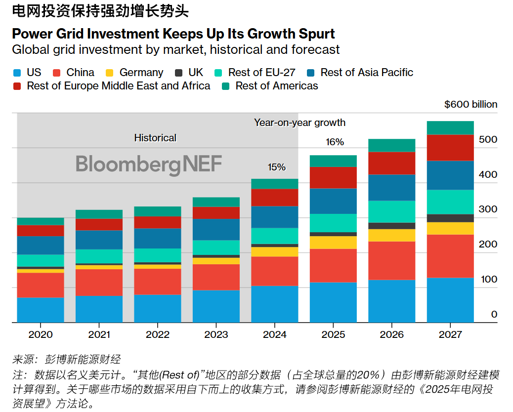 電網(wǎng)支出今年有望躍增16%,略高于去年15%的增幅,這表明電網(wǎng)支出增長已成為能源轉(zhuǎn)型中的固定特征。