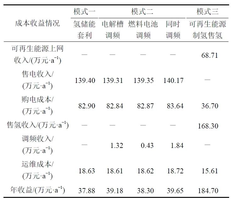 在商業(yè)模式二中,相比只利用氫燃料電池與只利用電解槽參與調(diào)頻的情況,二者同時(shí)參與調(diào)頻輔助服務(wù)市場(chǎng)下氫能電站收益更高。購(gòu)電成本的增加和售電收入的減少,說(shuō)明氫能電站在更多的時(shí)點(diǎn)選擇參與調(diào)頻,而不是通過(guò)電價(jià)差套利。然而,氫能電站規(guī)模較小是導(dǎo)致其調(diào)頻收入較少的原因之一。