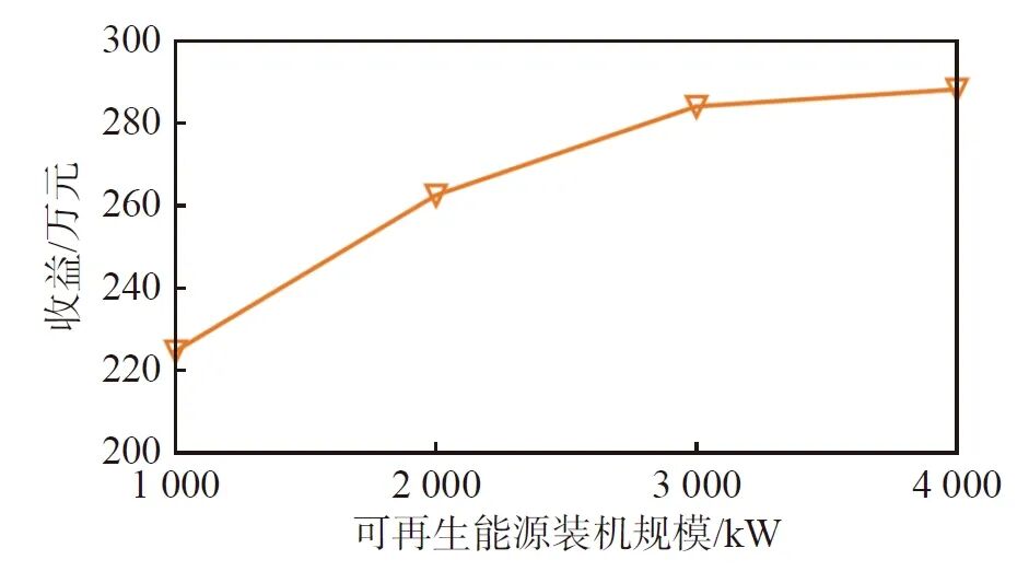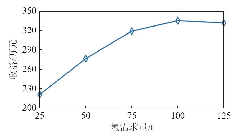 在可再生能源裝機(jī)規(guī)模固定的邊界條件下,分析氫需求量對(duì)氫能電站經(jīng)濟(jì)性的影響,結(jié)果如下圖所示。隨著氫需求量的增加,制氫成本可以在更大范圍內(nèi)攤銷(xiāo),提高了整體經(jīng)濟(jì)效益。然而,當(dāng)氫需求量達(dá)到一定水平后,設(shè)備容量接近飽和,邊際效益開(kāi)始遞減。當(dāng)需求量超過(guò)100噸時(shí),氫能電站不得不在電價(jià)高峰制氫以滿足氫需求,導(dǎo)致收益降低。因此,隨著氫能終端應(yīng)用的多元化,氫能電站的設(shè)備容量需與逐漸攀升的用氫需求相匹配。