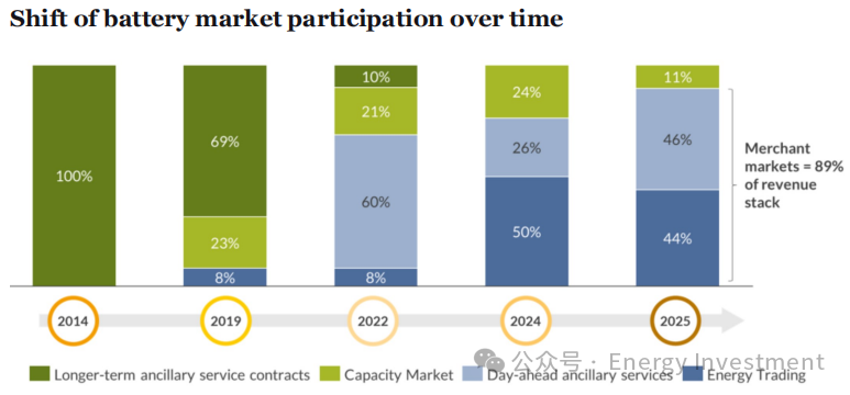 近年來(lái),英國(guó)儲(chǔ)能市場(chǎng)的核心敘事是從合同為王到交易致勝的轉(zhuǎn)變。隨著可再生能源發(fā)電占比的不斷提高,電力系統(tǒng)的波動(dòng)性顯著增加,導(dǎo)致批發(fā)市場(chǎng)的電價(jià)波動(dòng)愈發(fā)頻繁和劇烈。這為能夠靈活充放電的電池儲(chǔ)能創(chuàng)造了巨大的能源套利機(jī)會(huì)。與此同時(shí),電網(wǎng)約束問(wèn)題日益突出,使得能夠提供本地化服務(wù)的儲(chǔ)能資產(chǎn)在平衡機(jī)制中的價(jià)值凸顯。收入來(lái)源正發(fā)生結(jié)構(gòu)性遷移。頻率響應(yīng)服務(wù)等傳統(tǒng)輔助服務(wù)的收入占比正在下降,而能源交易和平衡機(jī)制的收入占比則快速上升,成為項(xiàng)目收益的主要構(gòu)成部分。
