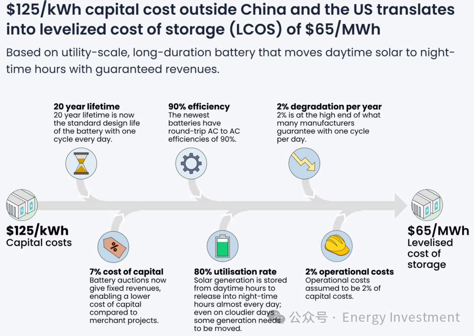 基于$125/kWh的投資成本,通過六個(gè)核心假設(shè)參數(shù)推導(dǎo)出儲(chǔ)能平準(zhǔn)化成本(LCOS)為$65/MWh: