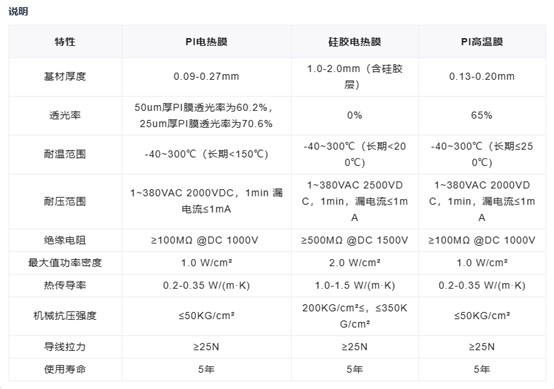 PI發(fā)熱片由PI絕緣膜-發(fā)熱線路-PI絕緣膜的三明治結(jié)構(gòu)組成,通過高溫高壓的固化工藝,多層結(jié)構(gòu)緊密粘合在一起,形成輕薄、厚度均勻的一體化結(jié)構(gòu)。PI加熱片因此有著有著柔性好、厚度薄、絕緣強(qiáng)度高、無毒且具有良好的耐熱性能等優(yōu)點(diǎn),適用于需要小面積、輕量化的加熱應(yīng)用。建議長期使用溫度≤150℃。