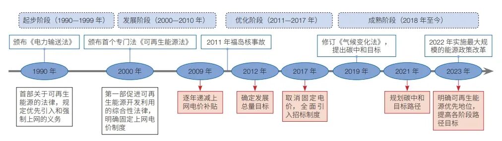 2000年,德國(guó)制定第一部專(zhuān)門(mén)的《可再生能源法》(EEG),并先后于2004年、2009年、2012年、2014年、2017年、2021年、2023年修訂7次EEG,及時(shí)解決可再生能源發(fā)展中出現(xiàn)的問(wèn)題。