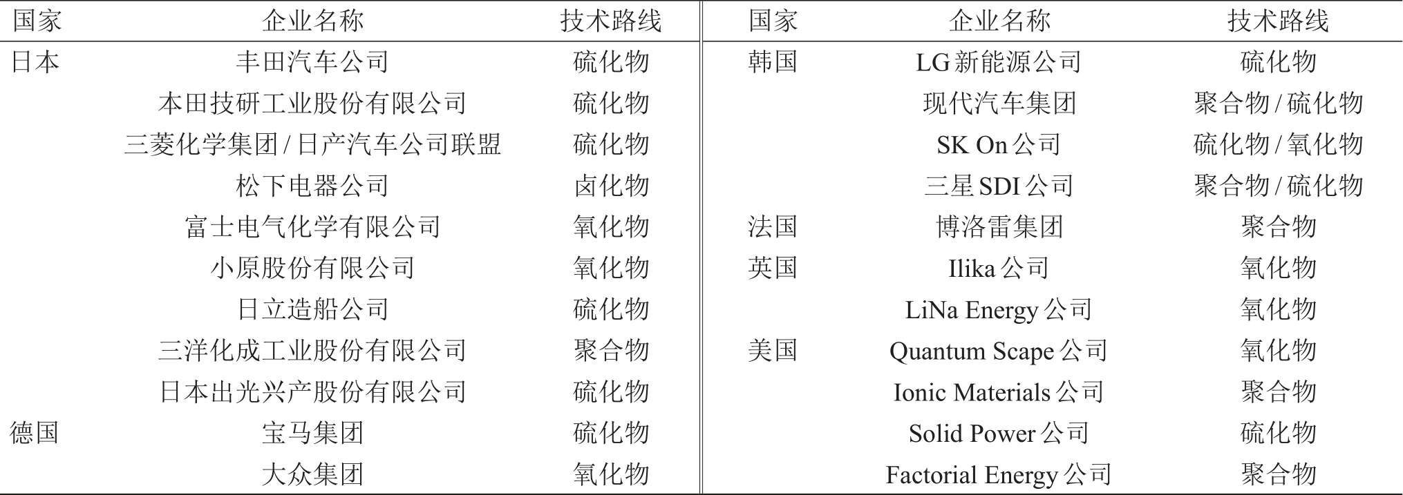全球固態(tài)電池產(chǎn)業(yè)主要分布在中國、日本、韓國、歐洲、美國等國家和地區(qū)。據(jù)不完全統(tǒng)計,截至2023年,全球約有53家規(guī)模以上企業(yè)布局和研發(fā)固態(tài)電池。表1和表2列舉了國內(nèi)外部分主要企業(yè)的固態(tài)電池技術(shù)路線。