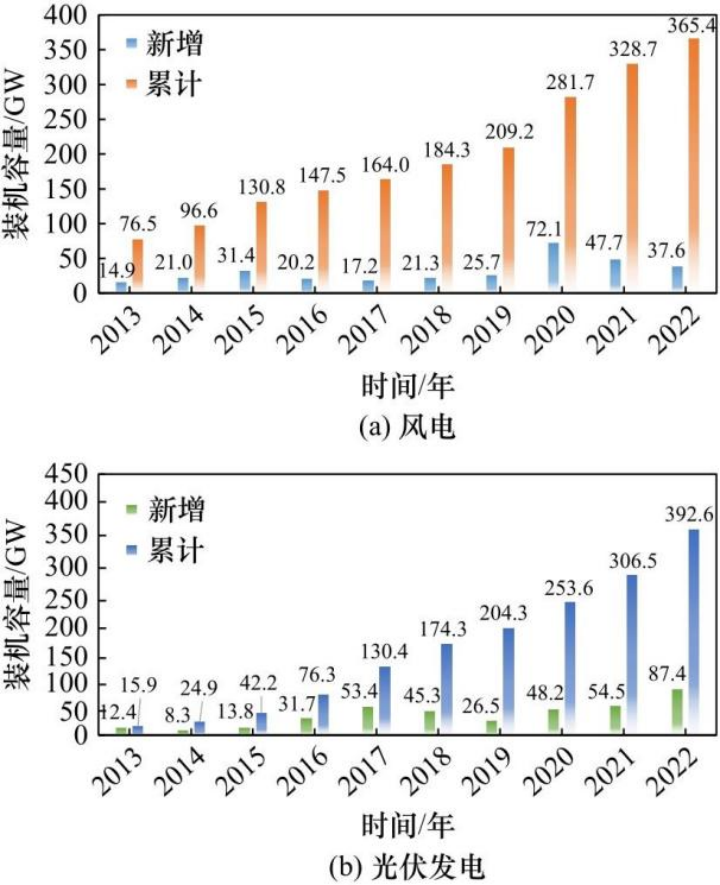 我國風(fēng)電新增、累計裝機容量分別在2009年、2010年升至世界首位,隨后保持至今。我國風(fēng)電行業(yè)先后經(jīng)歷3輪高速發(fā)展期,國家能源局發(fā)布的統(tǒng)計數(shù)據(jù)表明,截至2022年年底的風(fēng)電累計裝機容量約為370 GW。在光伏發(fā)電方面,2013—2022年我國累計裝機容量由15.9 GW增長至392.6 GW,年均增長率約為45%(見圖1);尤其是2022年,受政策利好驅(qū)動,新增裝機容量為87.4 GW,達到歷史高位。大力發(fā)展新能源、加快建設(shè)風(fēng)電和光伏發(fā)電基地是我國碳達峰行動的規(guī)劃任務(wù),這表明從中長期看,“雙碳”目標下風(fēng)電、光伏發(fā)電行業(yè)仍有較大的發(fā)展空間。