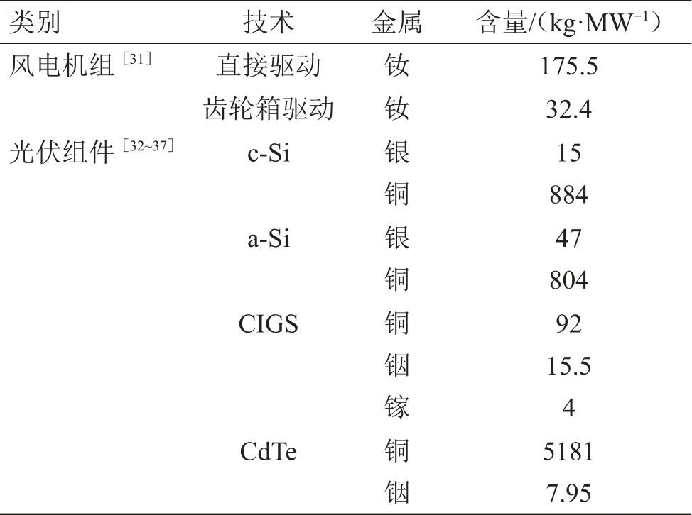 表3 風(fēng)電機組、光伏組件中的金屬含量數(shù)據(jù)