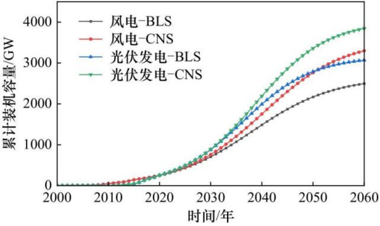 圖2 不同情景下我國風(fēng)電和光伏發(fā)電的累計裝機容量模擬