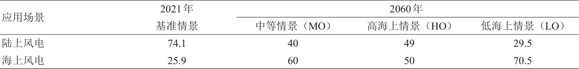 隨著技術(shù)進步,風(fēng)力發(fā)動機的葉輪尺寸不斷增大,具有更高的塔架和更長的葉片,以捕獲和轉(zhuǎn)換更多的風(fēng)能。2007年以來,1.5 MW風(fēng)電機組成為陸上裝機的主流機型,2015年后2 MW機組開始主導(dǎo)陸上市場,2022年新增陸上主流機型普遍為4~5 MW。2021年,陸上機組以2~4 MW為主,對應(yīng)占比為陸上裝機量的80%以上;海上機組以5~7 MW為主,對應(yīng)占比為海上裝機量的68%以上。依據(jù)未來風(fēng)電行業(yè)發(fā)展趨勢,設(shè)定相應(yīng)市場份額(見表4),反映未來陸上和海上不同規(guī)格風(fēng)電機組的占比以及金屬材料用量的差異。