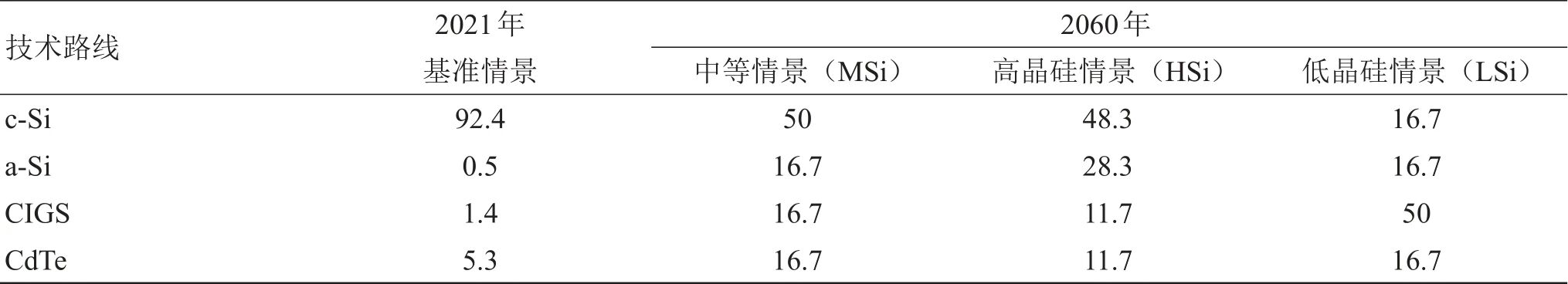 當前,c-Si、a-Si、CIGS、CdTe是4種代表性的光伏技術(shù),但未來光伏技術(shù)發(fā)展走向依然具有不確定性。針對我國光伏市場設(shè)定了3種技術(shù)情景:基準情景、高晶硅情景(c-Si、a-Si占比較高)、低晶硅情景(CIGS、CdTe占比較高)。在不同的情景下,各類技術(shù)路線的市場份額不同(見表5);所有情景均假設(shè)市場份額呈線性變化。